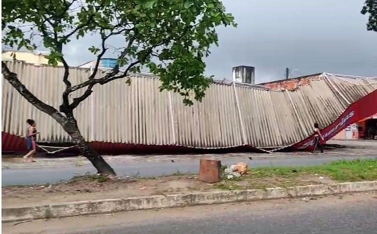 A marquise de um depósito de construção desabou, na manhã desta sexta-feira (15), por causa das fortes chuvas que atingem João Pessoa desde a madrugada. O estabelecimento funciona no bairro das Indústrias, na Zona Sul da capital paraibana. Apesar do incidente, ninguém ficou ferido.