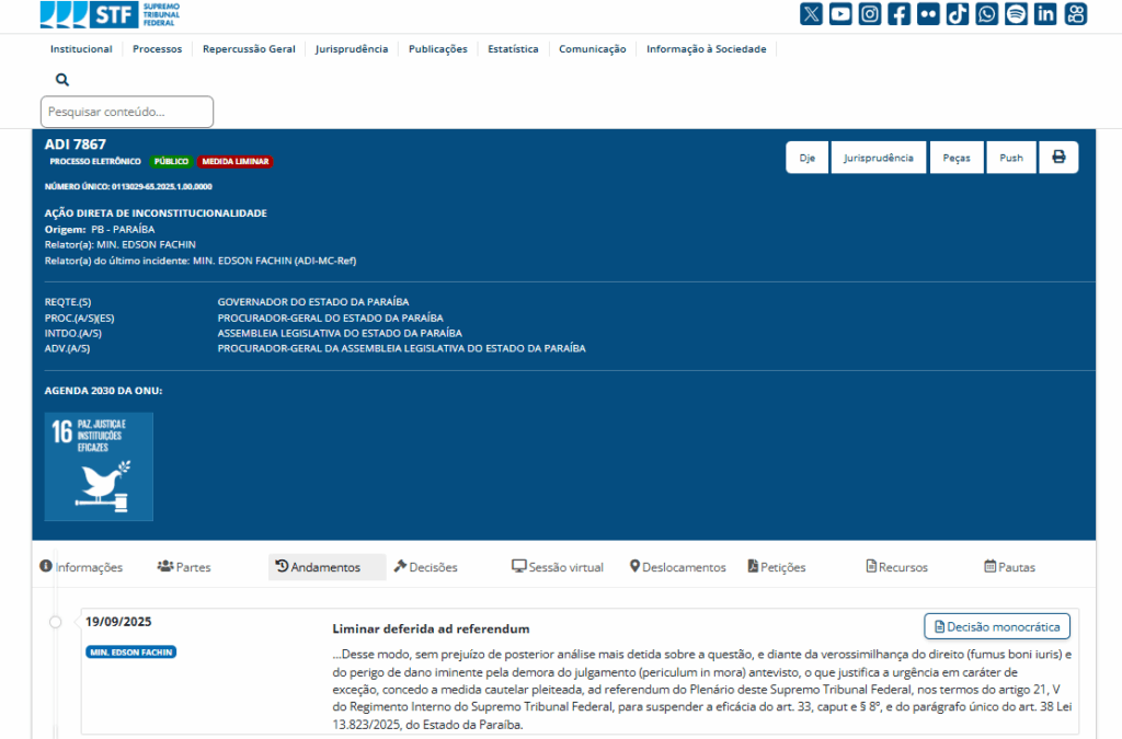Como verificado, Edson Fachin considerou ainda em sua decisão o perigo de dano iminente pela demora do julgamento, o que “justifica a urgência em caráter de exceção, concedo a medida cautelar pleiteada, ad referendum do Plenário deste Supremo Tribunal Federal, nos termos do artigo 21, V do Regimento Interno do Supremo Tribunal Federal, para suspender a eficácia do art. 33, caput e § 8º, e do parágrafo único do art. 38 Lei 13.823/2025, do Estado da Paraíba”.